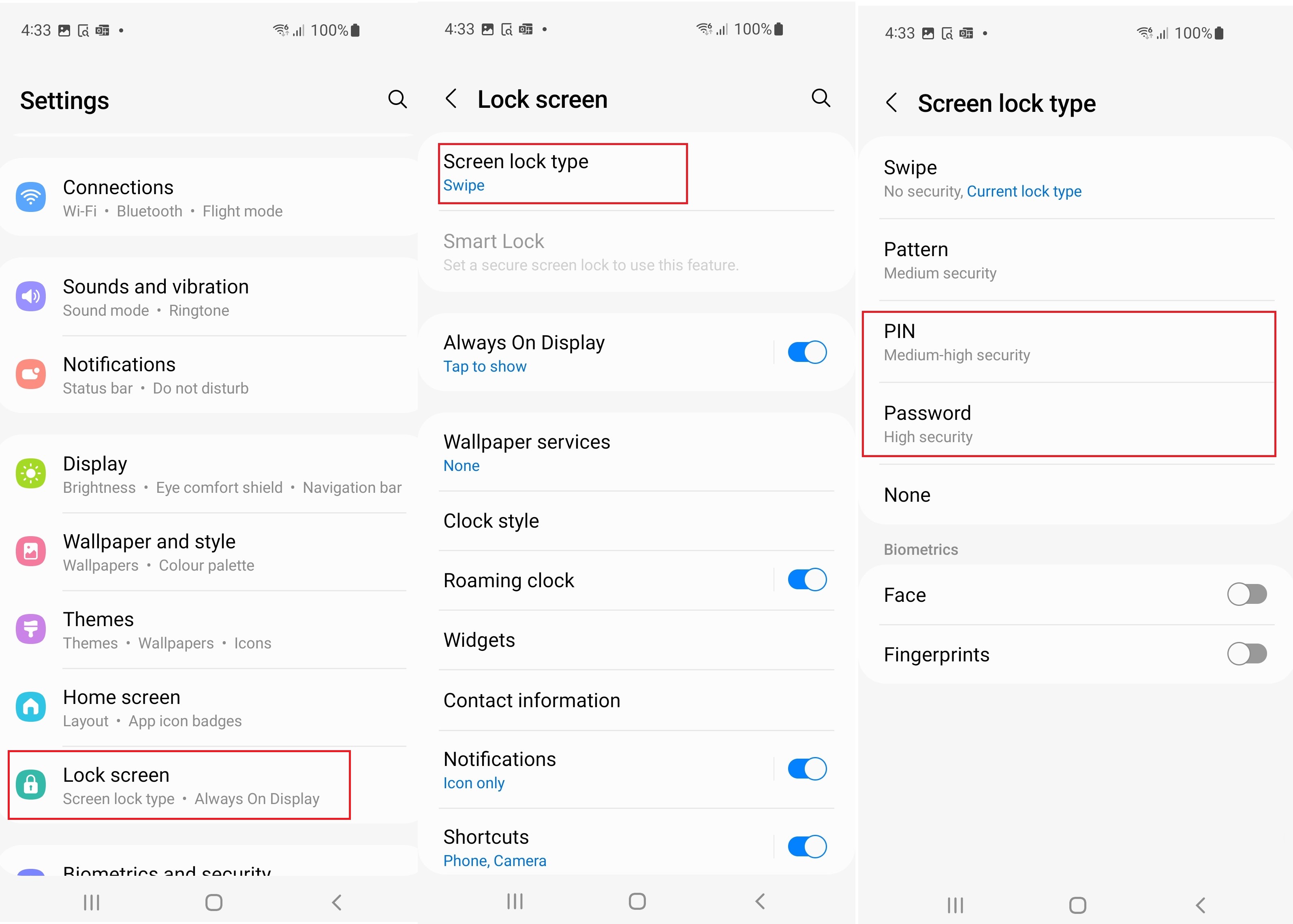 Set up a screen lock code. This is required to use Microsoft Applications such as Outlook, Word and Teams. Open the Android system settings, navigate to "Lock Screen" and set up PIN under "Screen Lock Type".
